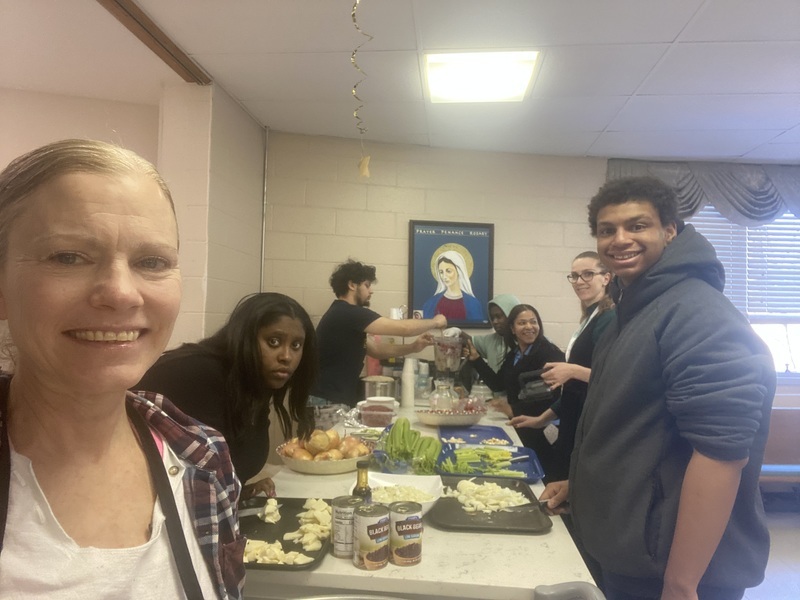 Ms. Sheridan and Ms. Dea with the students at the kitchen counter