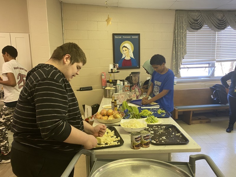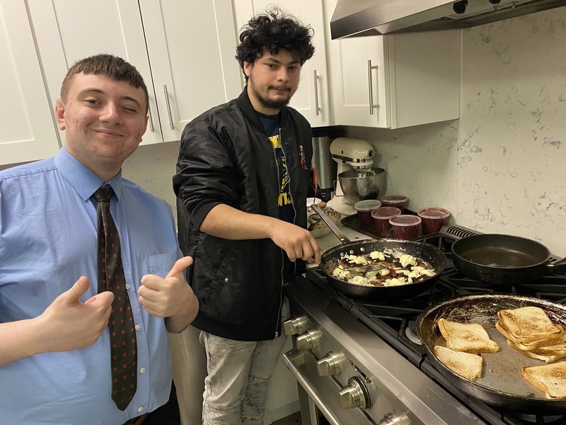The students in the kitchen making food