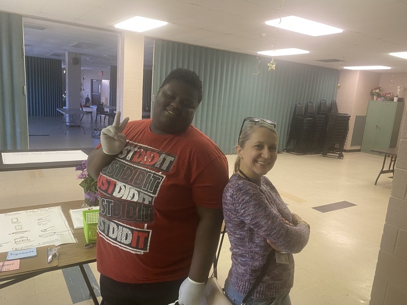 A student poses with his teacher Ms. Mancini in the kitchen